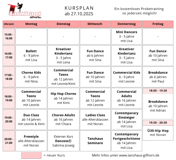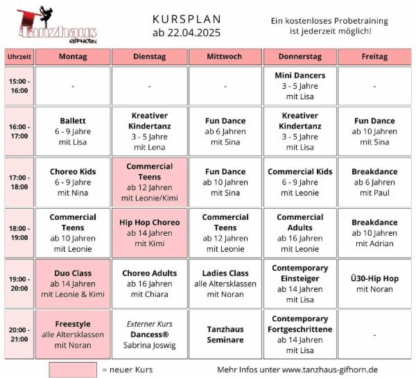 Ob klein oder groß, jung oder alt, Einsteiger oder Fortgeschritten, mit oder ohne Vorkenntnisse - bei uns findest du mit Sicherheit Deinen passenden Kurs oder Dein passendes Seminar! Sprich uns an - wir beraten Dich gerne und finden gemeinsam heraus, welcher Kurs und welcher Tanzstil am meisten Sinn macht.