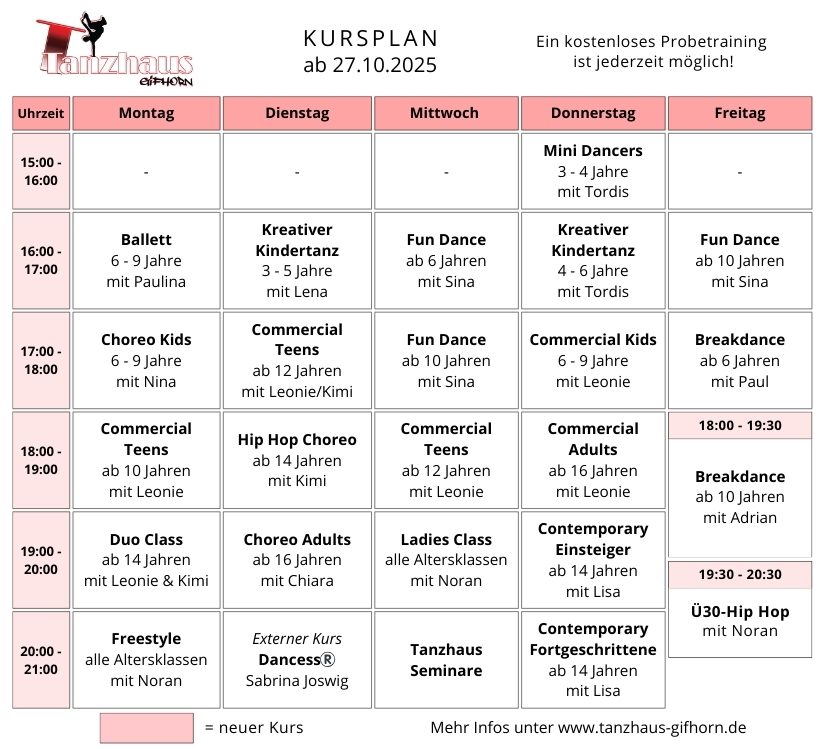Ob klein oder groß, jung oder alt, Einsteiger oder Fortgeschritten, mit oder ohne Vorkenntnisse - bei uns findest du mit Sicherheit Deinen passenden Kurs oder Dein passendes Seminar! Sprich uns an - wir beraten Dich gerne und finden gemeinsam heraus, welcher Kurs und welcher Tanzstil am meisten Sinn macht.